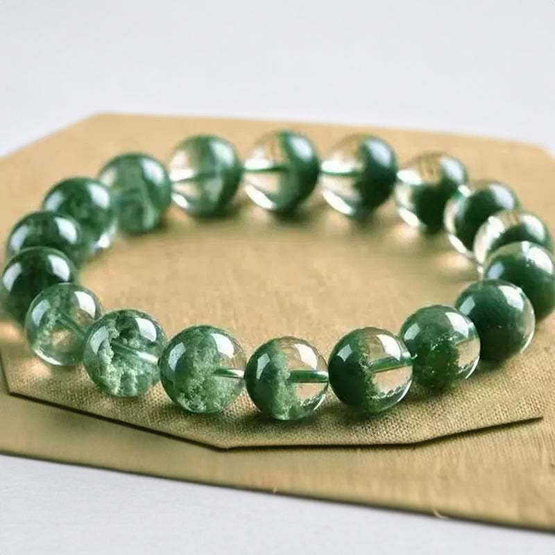 Beyond its aesthetic appeal, this natural green phantom crystal bracelet is highly regarded for its powerful energy properties. The green phantom crystal, with its internal green mineral inclusions, symbolizes vitality and abundance and is believed to attract wealth and good fortune.