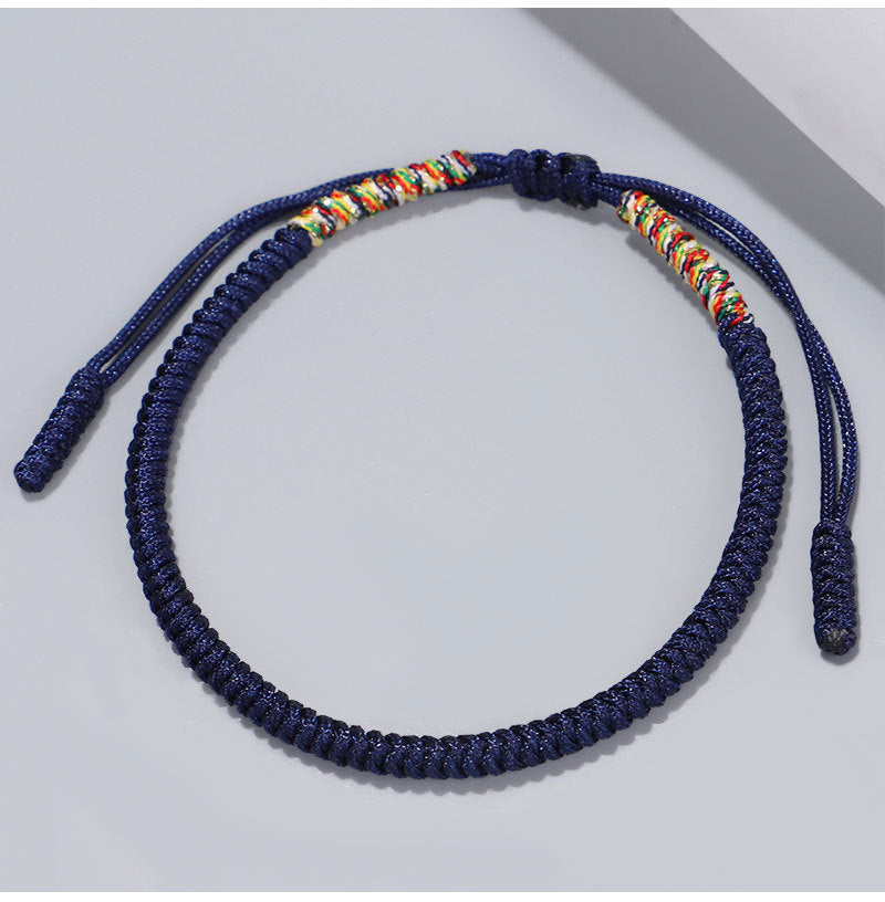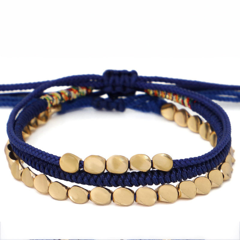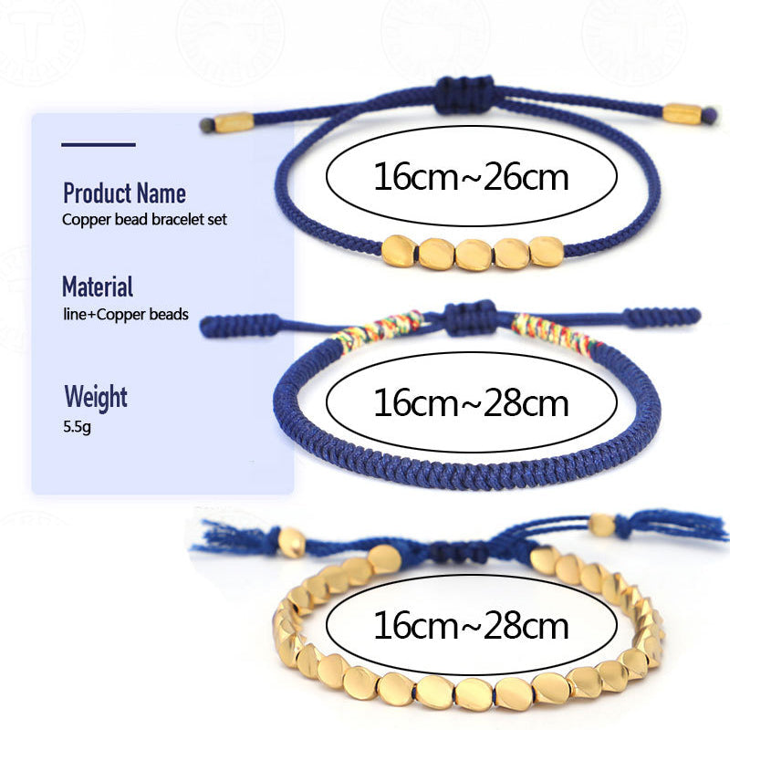 • Product Description : This handwoven navy blue bracelet set combines modern elegance with profound traditional symbolism. It is crafted from high-quality navy blue cord and adorned with golden brass beads, symbolizing wealth, prosperity, and protection. The combination of navy blue and gold creates a sophisticated and stylish look, while the adjustable sliding knot design fits wrist sizes from 16cm to 28cm, ensuring comfort.