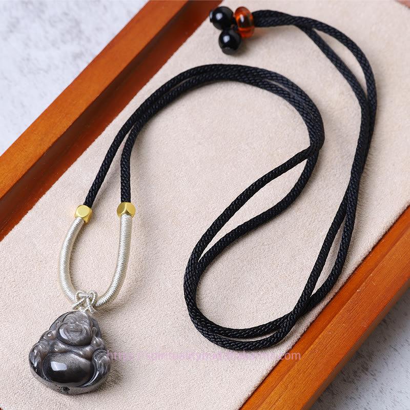 Buddha Energy Necklace Natural Silver Sheen Obsidian Laughing Buddha Protection Necklace Pendant
